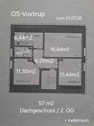 Kleine Wohnung (57m2) im 2. OG/Dachgeschoss in OS-Voxtrup, 3 Zimmer, Küche, Bad (siehe Grundriss) + Kellerraum und Platz für die Waschmaschine in der Waschküche im Keller.